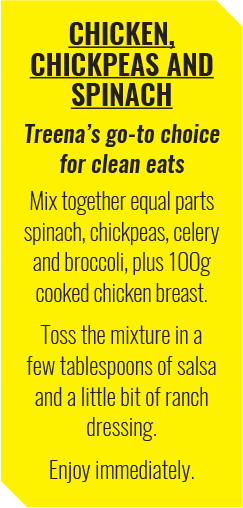 The challenging workouts were just what Treena needed to tighten up her frame and keep her spirits high. The nutritional side of things, however, didn’t go as smoothly. “As a picky eater who’s allergic to eggs, finding the right food that was palatable for me to eat for long periods of time was hard.” But find them she did, including Chicken, Chickpeas, and Spinach (see recipe at right), which became a regular part of her meal rotation.
