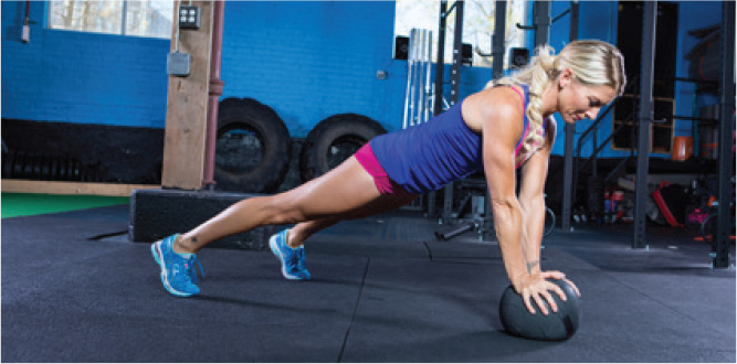 Start in a plank position with one hand on a medicine ball, one hand on the floor, and your feet shoulder-width distance apart. Lower your chest to 90 degrees. Press your hand into the ball, straighten your arm and lift your opposite arm from the floor engaging your core to keep your body flat and stable. Place your knees on the floor for an easier modification perform 5 to 10 reps per arm. Rest only as needed and move on to the next exercise.