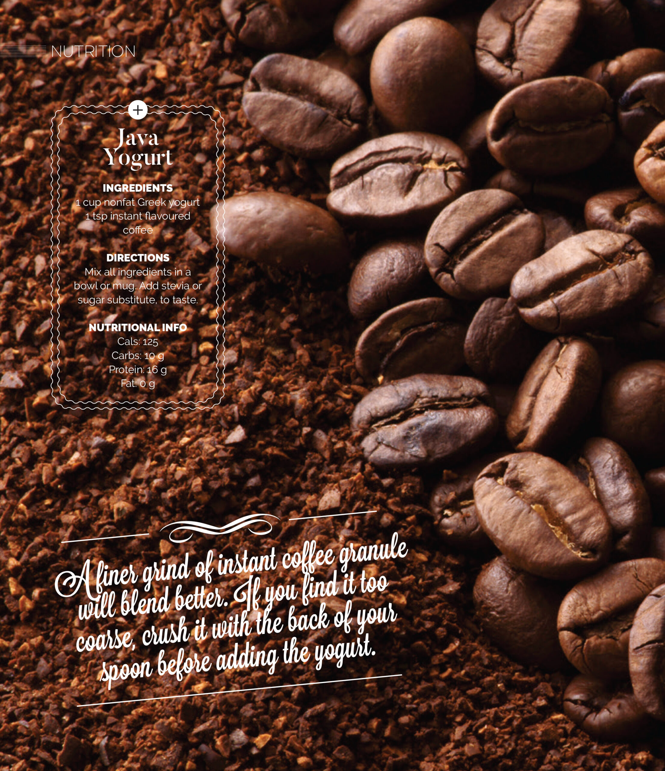 1 cup nonfat Greek yogurt, 1 tsp instant flavored coffee.