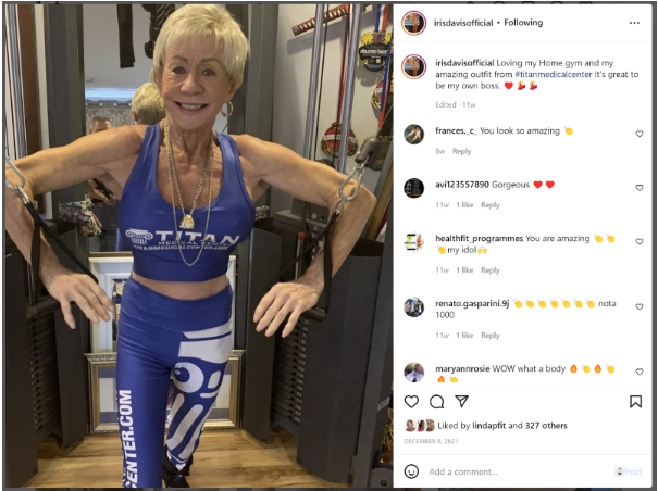 Why you should follow her: Iris at the gym, Iris on the dance floor, Iris at competitions, Iris flexing and showing us her lean, muscular body. This 78-year-old personal trainer is achieving her dreams and showing us that it’s never too late for that. She also shares exercise demos that we take note of for our next workout.