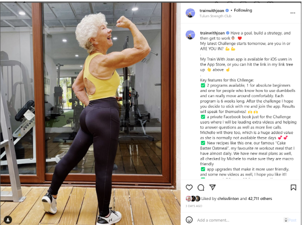 Why you should follow her: You can’t help but be in awe of Mary’s sumo lifting at 72. She shares snippets from her gym workouts, inspirational quotes (“A little progress each day add up to big results”) and some lighthearted humorous memes. Watching her journey and crush it at the gym at 72 is fuel to be a little more badass ourselves.