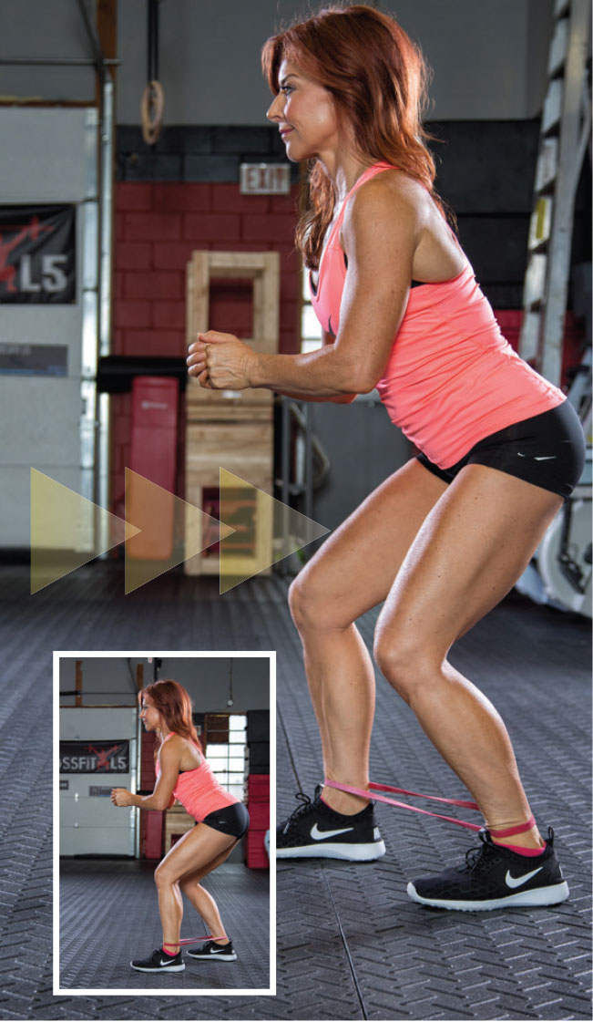 HOW: Loop a medium resistance band around your ankles. Lower into a semi-crouched position with knees bent and feet a bit wider than the hips. Step one foot forward, keeping the knee tracking over the toe, and then step the opposite foot forward. Maintain this crouched position, ensuring the band stays taut, as you walk across your workout area.