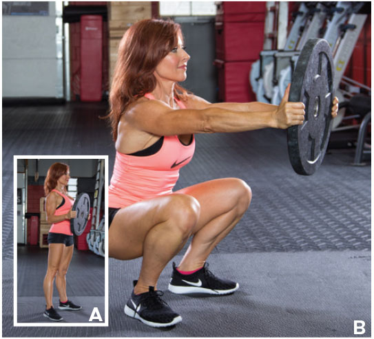 HOW: [A] Start by holding a lightweight against your chest and space your feet a little wider than hip-width apart. [B] Take a deep breath, brace your core, and press the weight in front of you as you bend at the hips and knees to squat down. As you stand back up to finish one rep, bring the plate back toward your chest