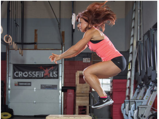 HOW: Stand about two feet from a 30-inch box. Breathe in deeply, bend your hips and knees, and swing your arms behind you. Explosively jump up onto the box, shooting your arms forward as you leap. Land with soft feet, about hip-distance apart.