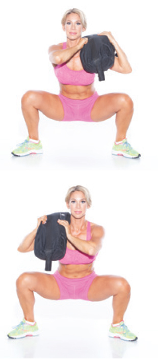 Keeping your chest up and the sandbag hugged tigh , sit your butt back and down. Squat as low as you can and sit back in your heels. Keep your back straight, and make sure your heels stay down . Drive straight back up, pushing through your heels. Squeeze your glutes at the top and stand up nice and tall, hugging the sandbag tight. Repeat for the desired amount of repetitions.