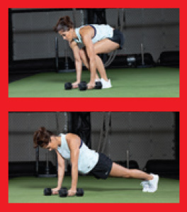 Stand with your feet shoulder-width apart and dumbbells facing each other by your sides. Engage your core and place the dumbbells on the floor in front of you, stacked under your shoulders. Hop your legs back to a high plank position and quickly hop back in to stand. With your palms facing forward, perform a biceps curl and return to the starting position. Repeat 10 to 12 times; rest 30 seconds.