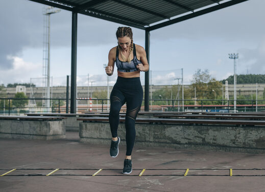 LIKE THIS … Place an agility ladder flat on the ground. Perform 30-second intervals of work followed by 30 seconds of rest. Try high knees (running through the ladder, landing one foot in each square and bringing your knees up to hip height), in-and-outs (jumping your feet inside each square and then out, landing in a squat), and slaloms (moving up one side of the ladder in a skiing motion, keeping your feet together and jumping in and out of each square).