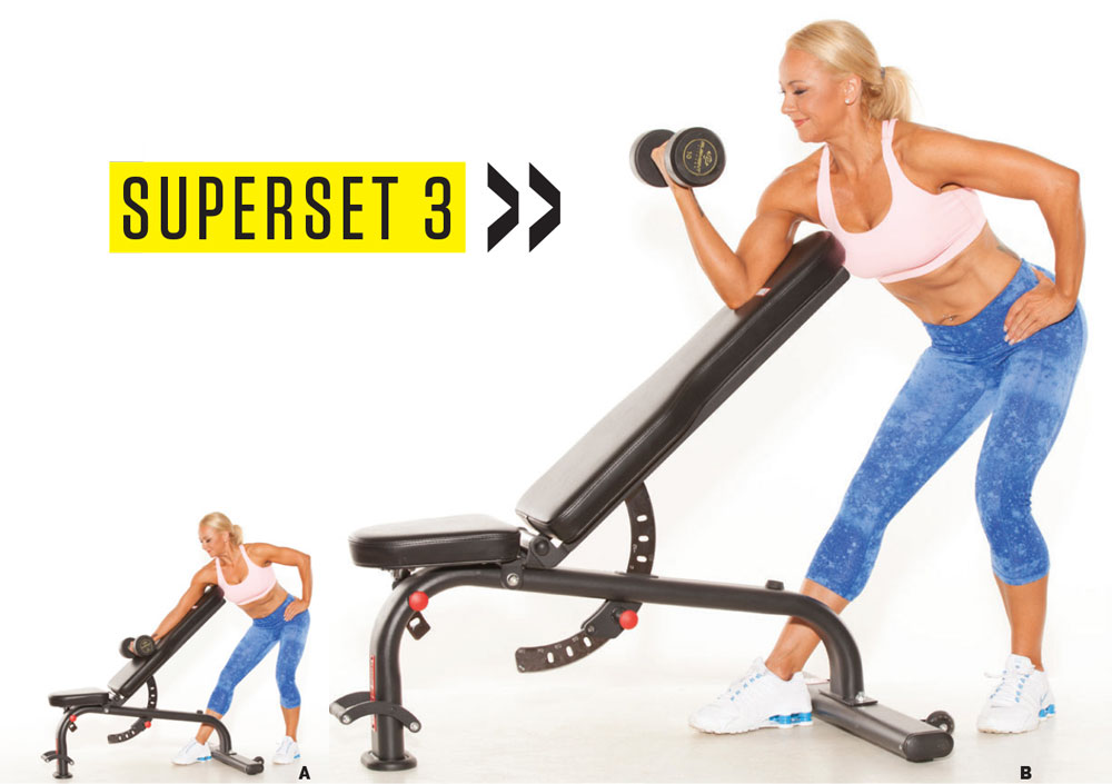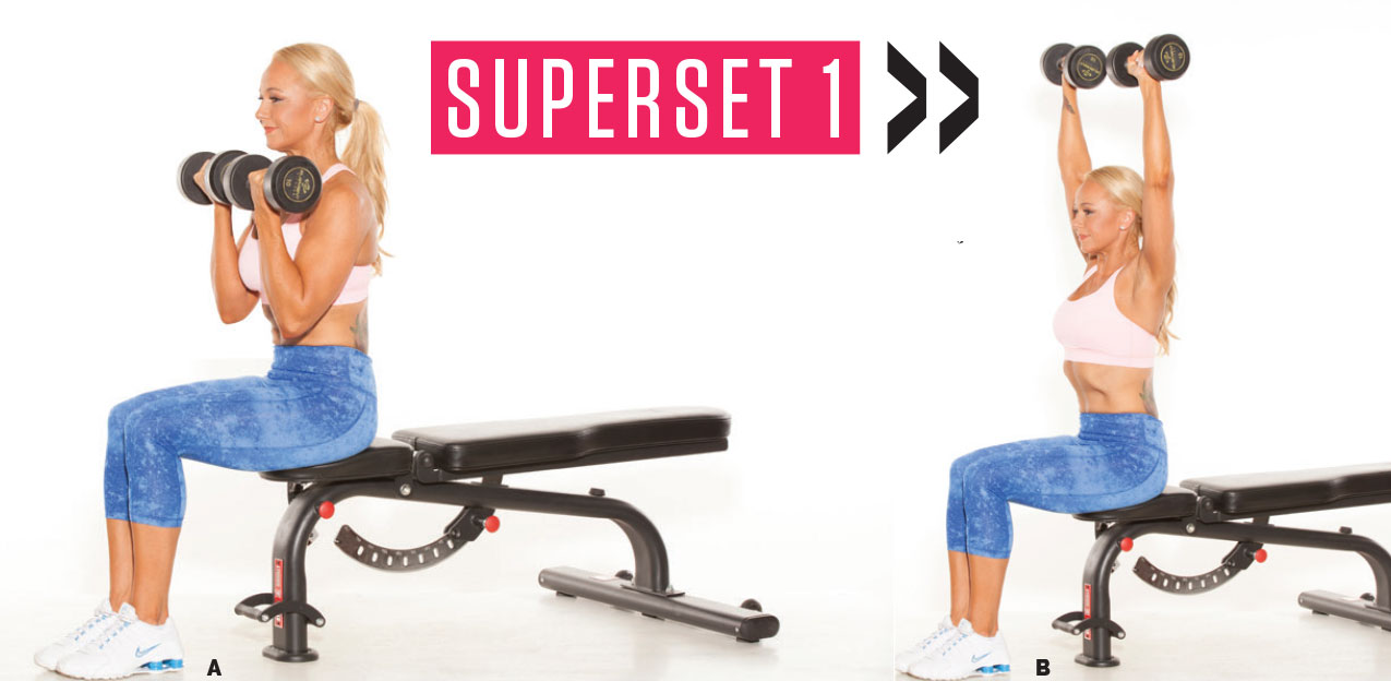 This workout is designed to target your entire upper body, helping you build a toned core, sleeker arms, and popping shoulders, using a powerful technique called supersets. A superset is two exercises performed back-to-back, targeting different or the same muscle groups with no rest in between. Supersets are a great way to boost your training efficiency – they are key to muscle growth as they help you build size quickly, and they are superb at developing strength and power. Supersets also boost your metabolic rate, which is great for fat loss, and since they burn more calories than your traditional weight-training program, due to their quicker pace and higher intensity, performing supersets will help with your endurance as well. They are also time-efficient. By performing the sets successively, you reduce your total workout time, which is great if you want to get in and out of the gym quickly.