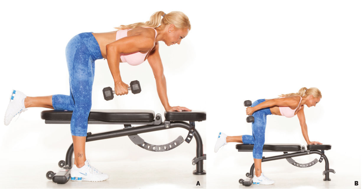 [A] Place one knee on a flat bench, supporting yourself with your non-working arm. Grab a dumbbell in your other hand using a neutral grip and lift your upper arm until it is parallel to the Keep your back straight and look forward.