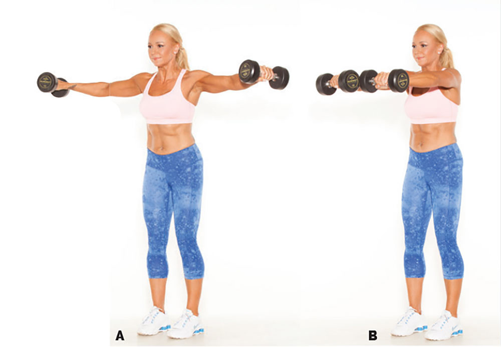 [B] Next, raise both arms in front of you to shoulder height, then lower back to the start. Repeat, alternating between the lateral and front raise.