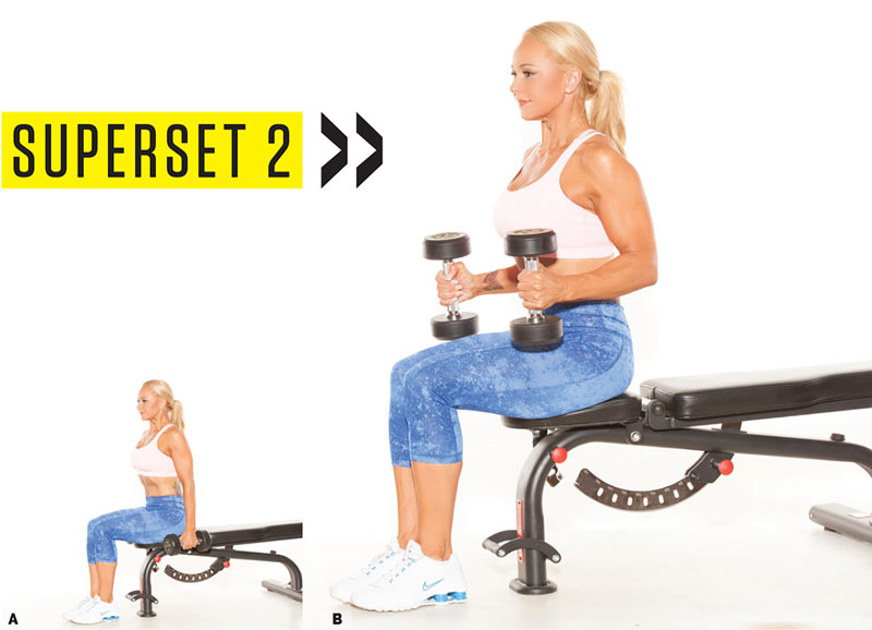 [A] Sit on the end of & flat bench holding a dumbbell with a neutral grip in each hand at your sides.