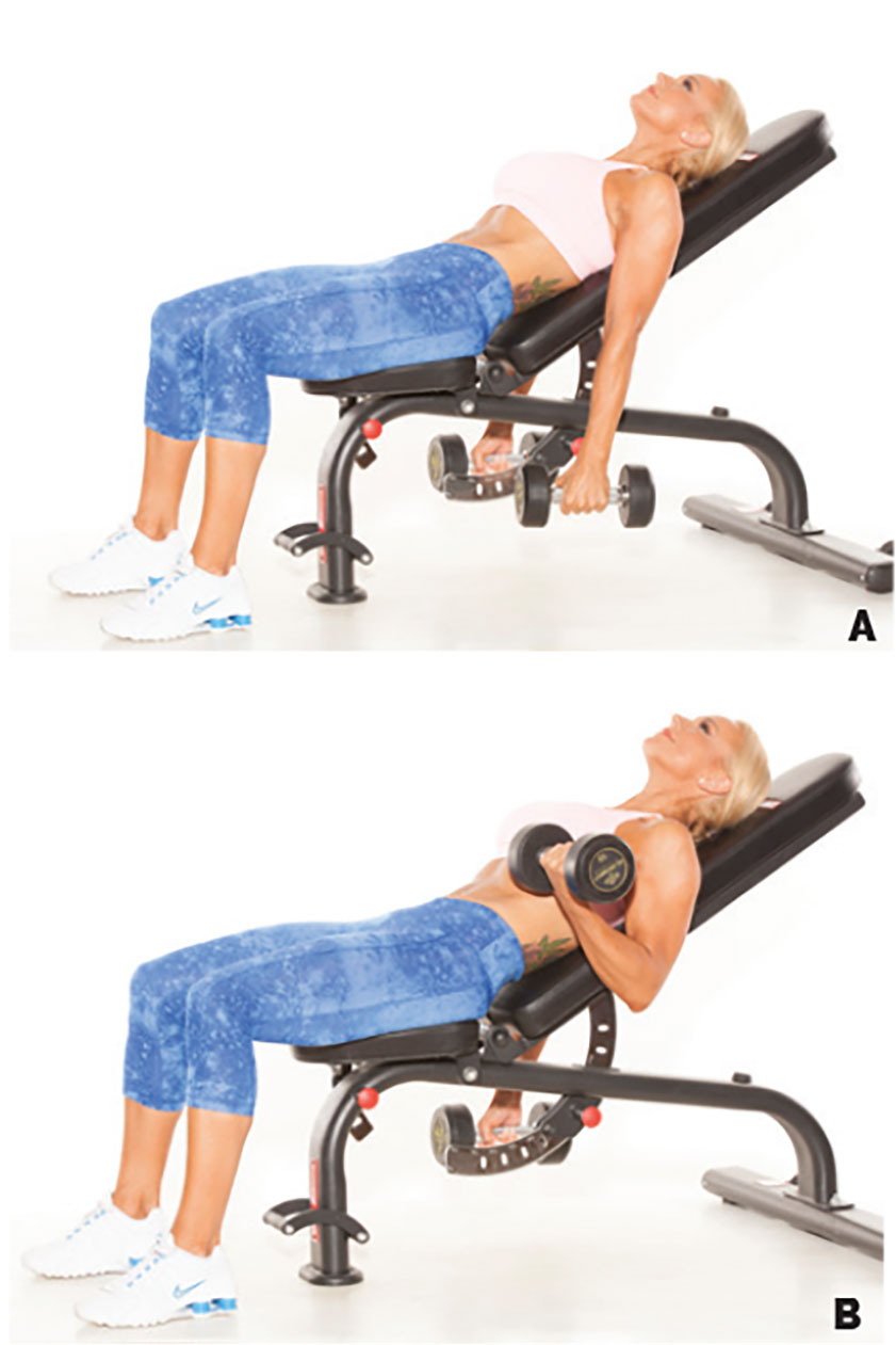 [A] Sit on an incline bench and hold one dumbbell in each hand at your sides.