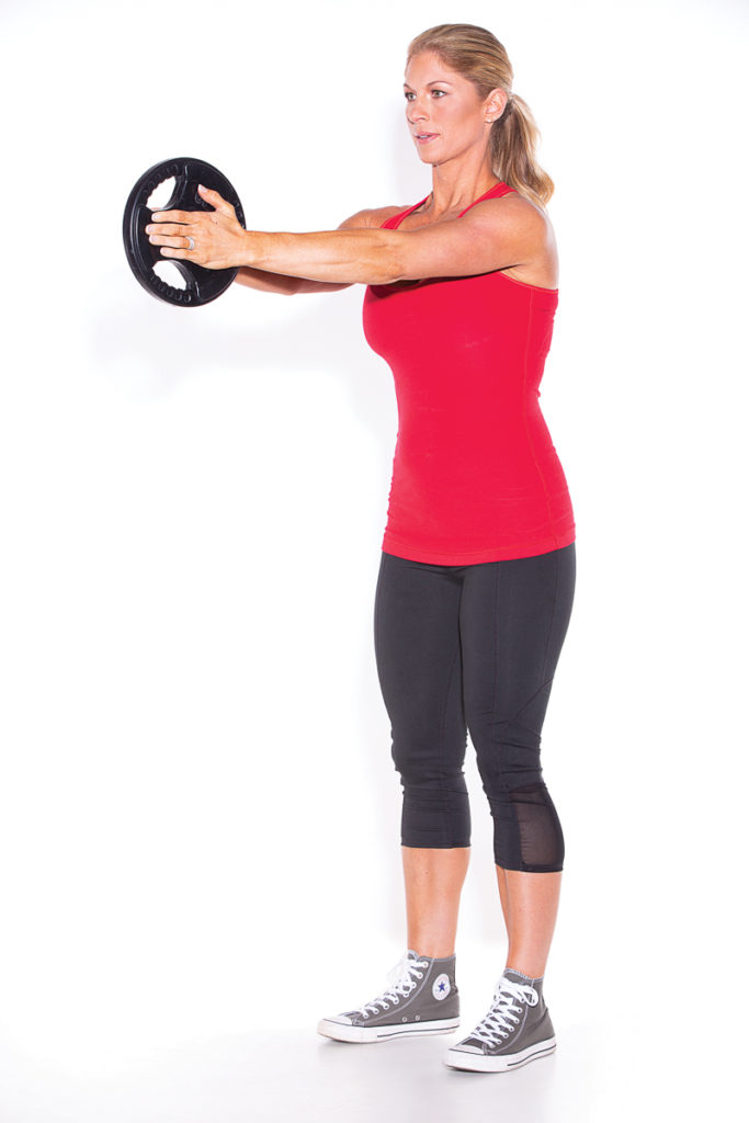 Stand with your feet a little wider than shoulder-width apart. Hold two weight plates together between both hands, fingertips pointing forward, at chest height. Keep constant pressure on the plates throughout to keep them from falling. Brace your core and keep your shoulders down.