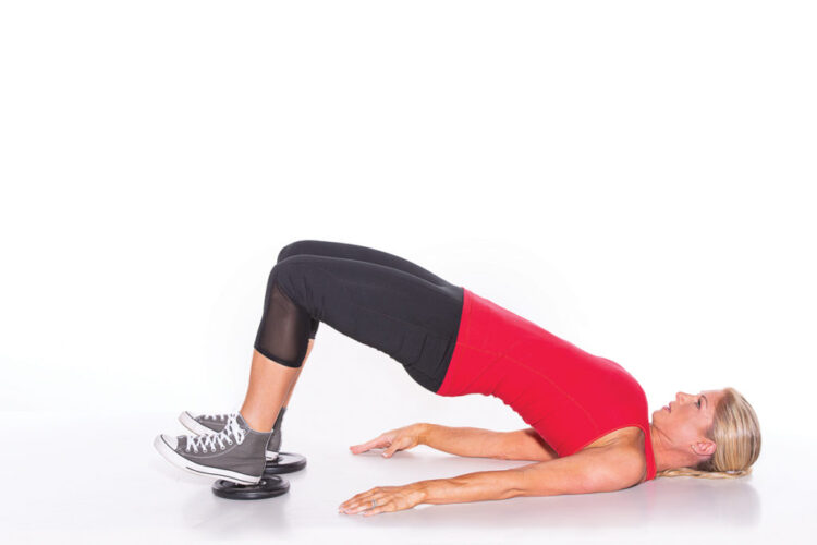 Lie face up, knees bent, with a plate under each heel. Squeeze your glutes and lift your hips off the ground, creating a straight line from your shoulders to your knees.