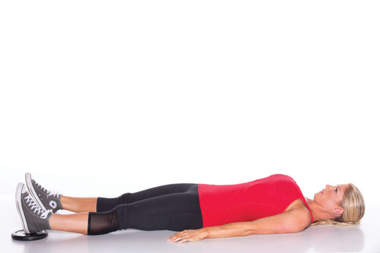 Push the plates away from your body with your heels. Once your legs are fully extended, pull the plates back in toward your butt with your heels, raising your toes off the ground to activate your glutes and hamstrings.