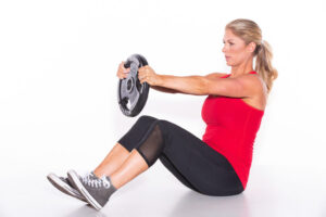 Sit on the floor with your hips and knees bent 90 degrees. Hold a weight straight out in front of you and keep your back straight (your torso should be at about 45 degrees to the floor). Twist your torso as far as you can to the left, and then reverse the motion, twisting as far as you can to the right. That’s one rep.