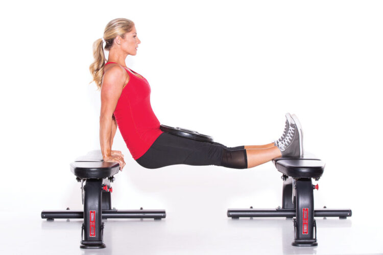 Sit on the inside of one of two benches placed parallel to each other. Place your hands on the edge of the bench. Straighten your arms, slide your rear end off the edge of the bench, and position your heels on the adjacent bench with your legs straight. Have someone place a weight on your lap near your hips.